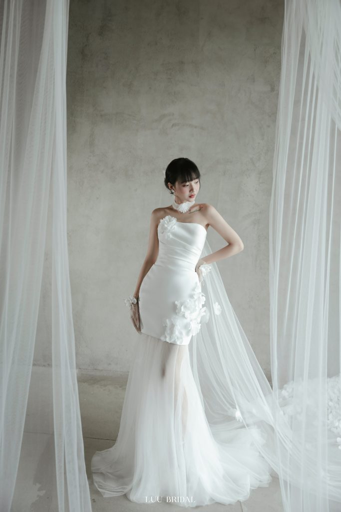 Celestia là tuyên ngôn của những cô dâu yêu phong cách tối giản nhưng không nhạt nhòa. Thiết kế trễ vai mềm mại, phối cùng phần chân váy bất đối xứng độc đáo giúp tôn trọn đường nét hình thể mà vẫn giữ được nét tinh tế.